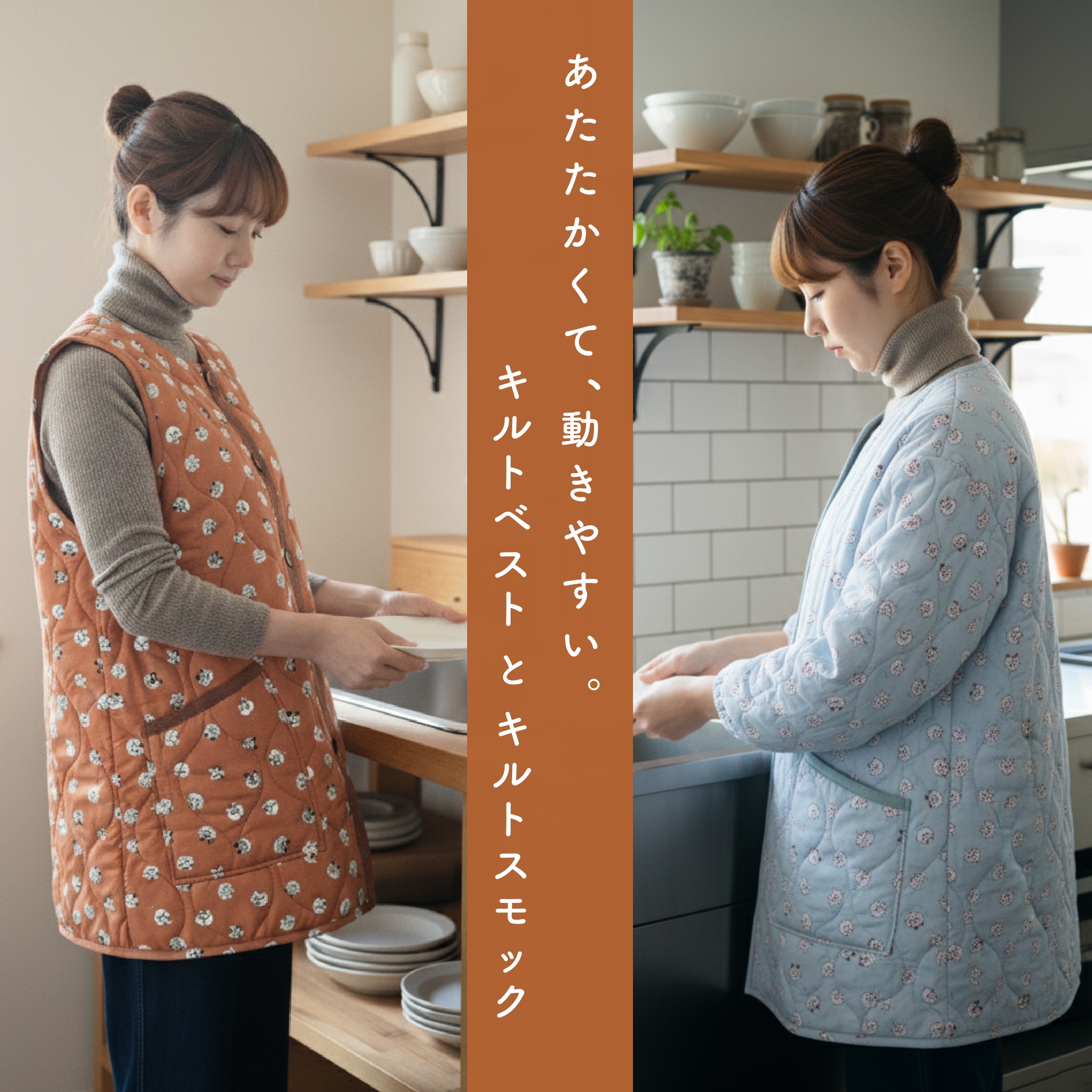 冬のおうち時間にぴったりの新定番、キルトベストとキルトスモックができました。