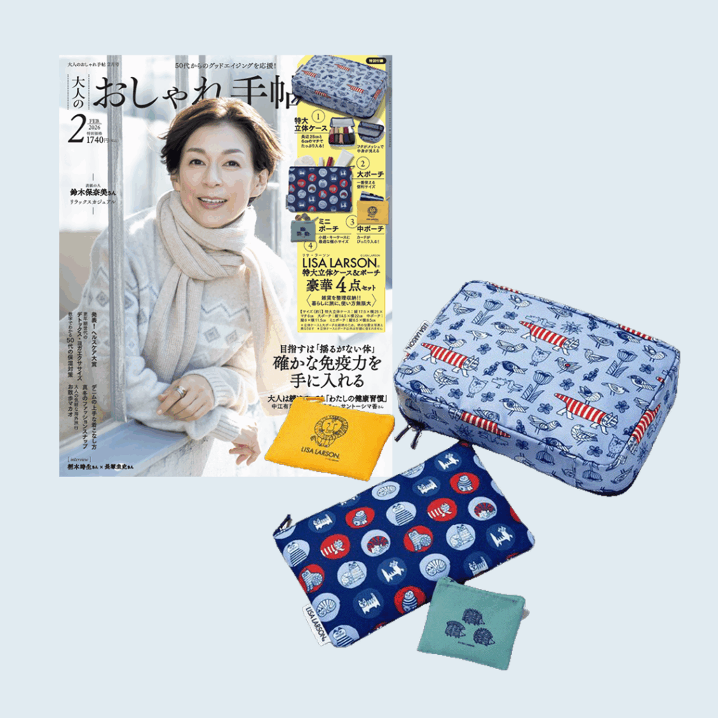 2026年1月7日(水)発売の『大人のおしゃれ手帖』2月号の特別付録に、リサ・ラーソンの「特大立体ケース&ポーチ豪華4点セット」が登場します。 今回の付録は、旅先での整理整頓から、日々のバッグの中身